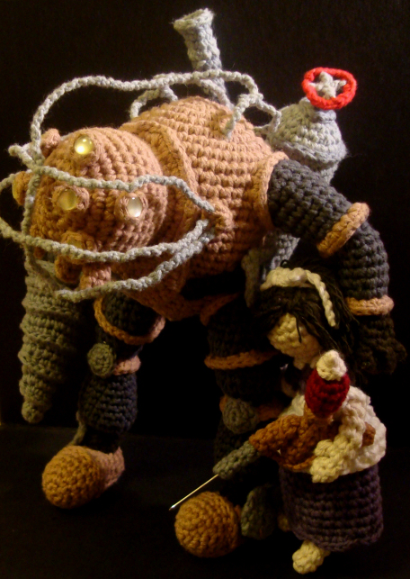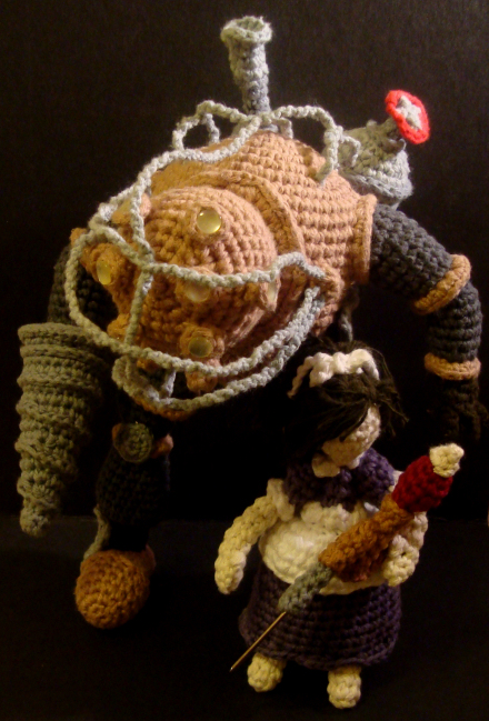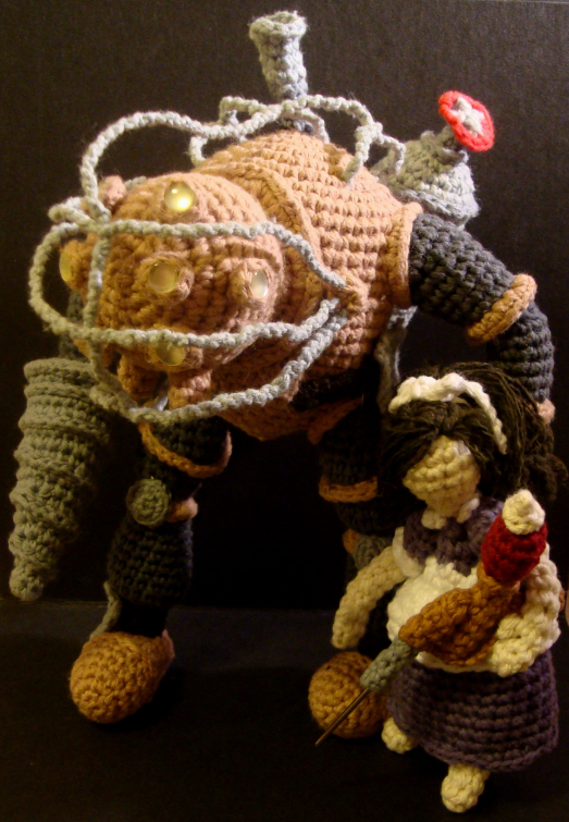 Her clothes and hair are in the style of the Bioshock 2 Little Sister, and though I think there is still some tweaking to do, I am pretty happy with it. The Adam needle is a separate piece with a yarn needle stuck in the end. I didn’t give her a face, because I thought about it and decided that anything embroidered or applied was likely to look cartoony and not as eerie and vacant as the Little Sisters are. Not having a face I think, speaks to the altered uniform states all of them are in, not really there at all. She’s not aged or bloodied, to match her Big Daddy, true to a yarn representation of something messy, bloody, dirty and worn, but made of yarn, so none of those things.